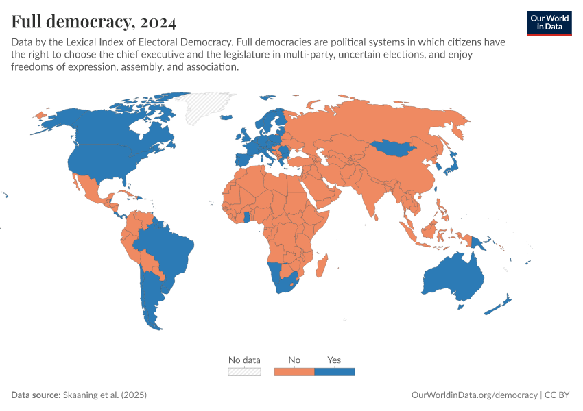 Skaaning et al. (2025) – processed by Our World in Data. “Full democracy” [dataset]. Skaaning et al., “Lexical Index of Electoral Democracy (LIED) v6.8” [original data]. Retrieved February 28, 2026 from https://data-diet-americans.owid.pages.dev:8789/20260119-065148/grapher/full-democracy-lexical.html (archived on January 19, 2026).
