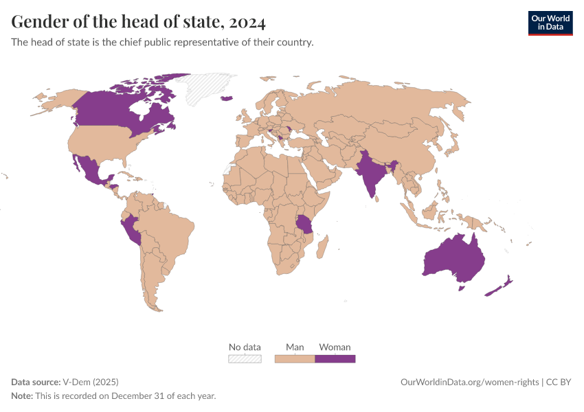 V-Dem (2025) – processed by Our World in Data. “Gender of the head of state” [dataset]. V-Dem, “Democracy report v15” [original data]. Retrieved February 28, 2026 from https://data-diet-americans.owid.pages.dev:8789/20260119-070102/grapher/gender-of-the-head-of-state.html (archived on January 19, 2026).