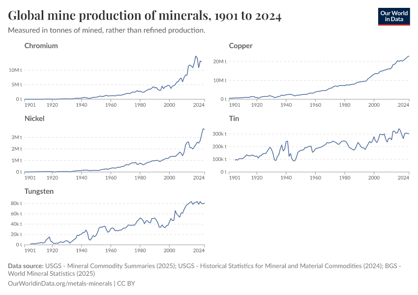USGS - Mineral Commodity Summaries (2025); USGS - Historical Statistics for Mineral and Material Commodities (2024); BGS - World Mineral Statistics (2025) – with major processing by Our World in Data. “Global mine production of minerals” [dataset]. United States Geological Survey, “Mineral Commodity Summaries”; United States Geological Survey, “Historical Statistics for Mineral and Material Commodities”; British Geological Survey, “World Mineral Statistics” [original data]. Retrieved February 28, 2026 from https://data-diet-americans.owid.pages.dev:8789/20260116-170644/grapher/global-mine-production-minerals.html (archived on January 16, 2026).