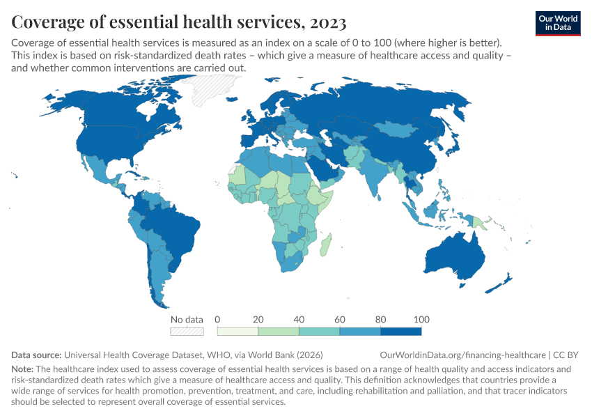 “Data Page: Coverage of essential health services”. Our World in Data (2026). Data adapted from Universal Health Coverage Dataset, WHO, via World Bank. Retrieved from https://data-diet-americans.owid.pages.dev:8789/20260202-181317/grapher/healthcare-access-quality-un.html [online resource] (archived on February 2, 2026).How to cite this data