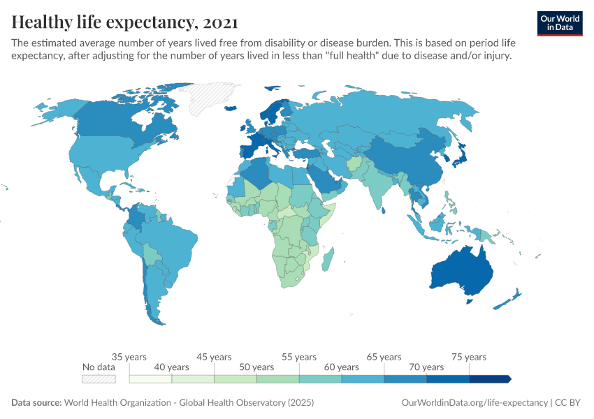 “Data Page: Healthy life expectancy”. Our World in Data (2026). Data adapted from World Health Organization. Retrieved from https://data-diet-americans.owid.pages.dev:8789/20260119-070102/grapher/healthy-life-expectancy-at-birth.html [online resource] (archived on January 19, 2026).How to cite this data
