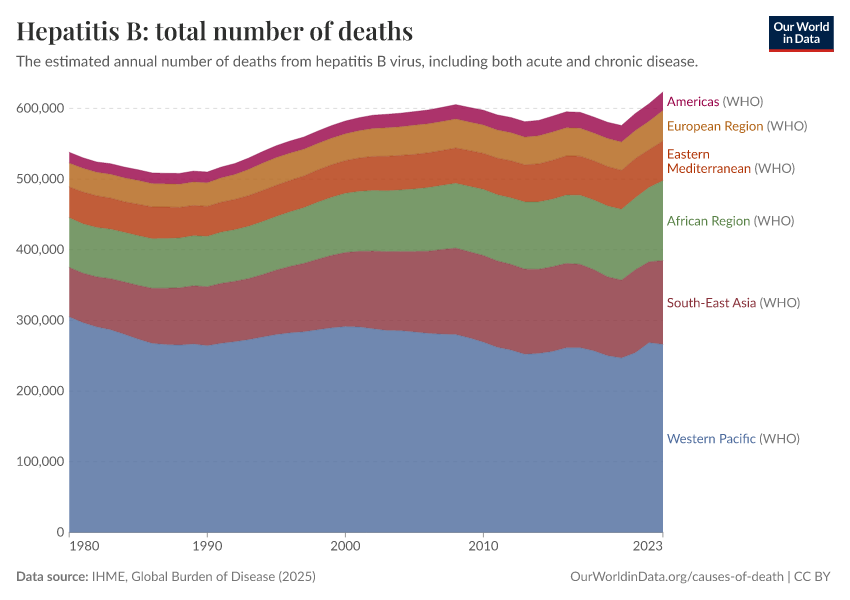 IHME, Global Burden of Disease (2025) – with major processing by Our World in Data. “Hepatitis B: total number of deaths” [dataset]. IHME, Global Burden of Disease, “Global Burden of Disease - Deaths” [original data]. Retrieved February 28, 2026 from https://data-diet-americans.owid.pages.dev:8789/20260211-174736/grapher/hepatitis-b-number-of-deaths.html (archived on February 11, 2026).