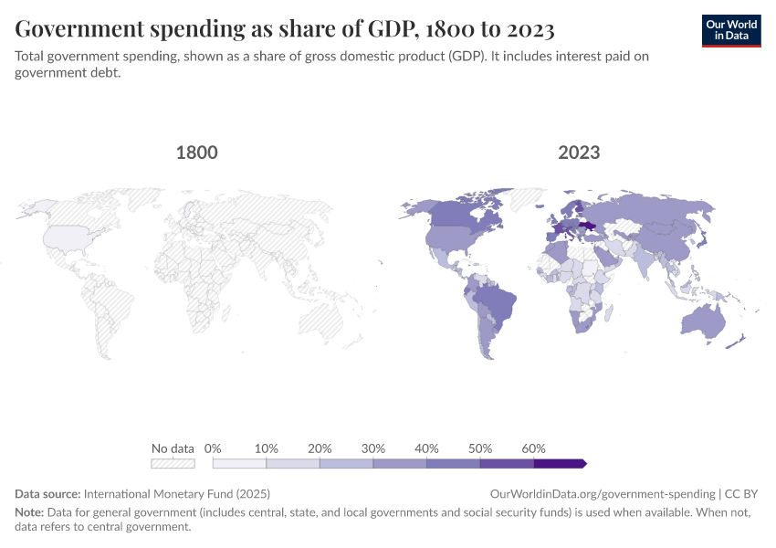 International Monetary Fund (2025) – with minor processing by Our World in Data. “Government spending as share of GDP” [dataset]. International Monetary Fund, “Public Finances in Modern History” [original data]. Retrieved February 28, 2026 from https://data-diet-americans.owid.pages.dev:8789/20250909-093708/grapher/historical-gov-spending-gdp.html (archived on September 9, 2025).