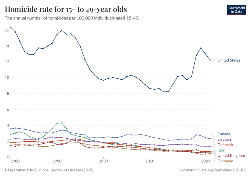 “Data Page: Homicide rate for 15- to 49-year olds”, part of the following publication: Esteban Ortiz-Ospina and Max Roser (2016) - “Global Health”. Data adapted from IHME, Global Burden of Disease. Retrieved from https://data-diet-americans.owid.pages.dev:8789/20260211-174736/grapher/homicide-rate-in-15--to-49-year-olds.html [online resource] (archived on February 11, 2026).How to cite this data