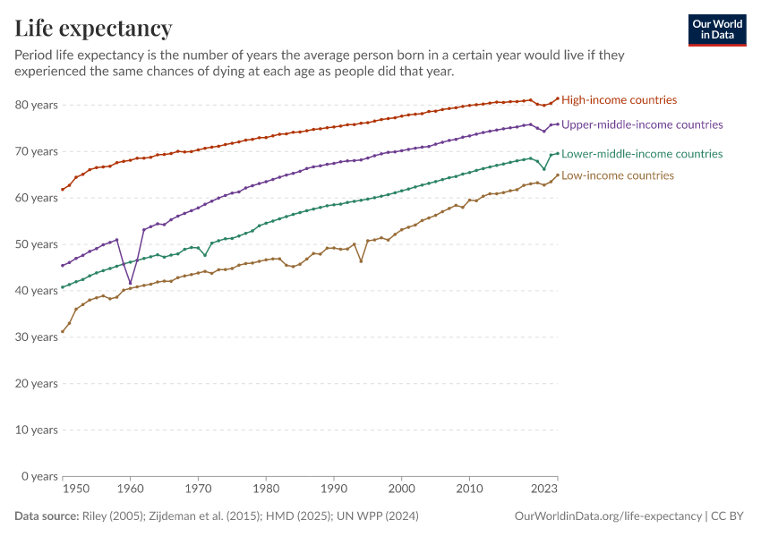 - This chart shows long-run estimates of life expectancy compiled by our team from several data sources. Before 1950, for country-level data, we rely on the Human Mortality Database (2025) combined with Zijdeman (2015). For regional data, we use Riley (2005). From 1950 onward, we use the United Nations World Population Prospects (2024).