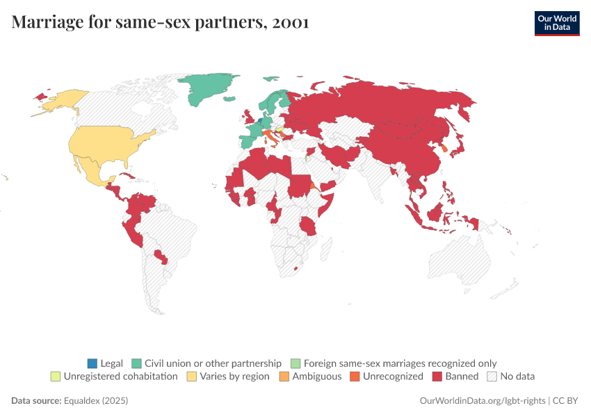 “Data Page: Marriage for same-sex partners”, part of the following publication: Bastian Herre and Pablo Arriagada (2023) - “LGBT+ Rights”. Data adapted from Equaldex. Retrieved from https://data-diet-americans.owid.pages.dev:8789/20250909-093708/grapher/marriage-same-sex-partners-equaldex.html [online resource] (archived on September 9, 2025).How to cite this data