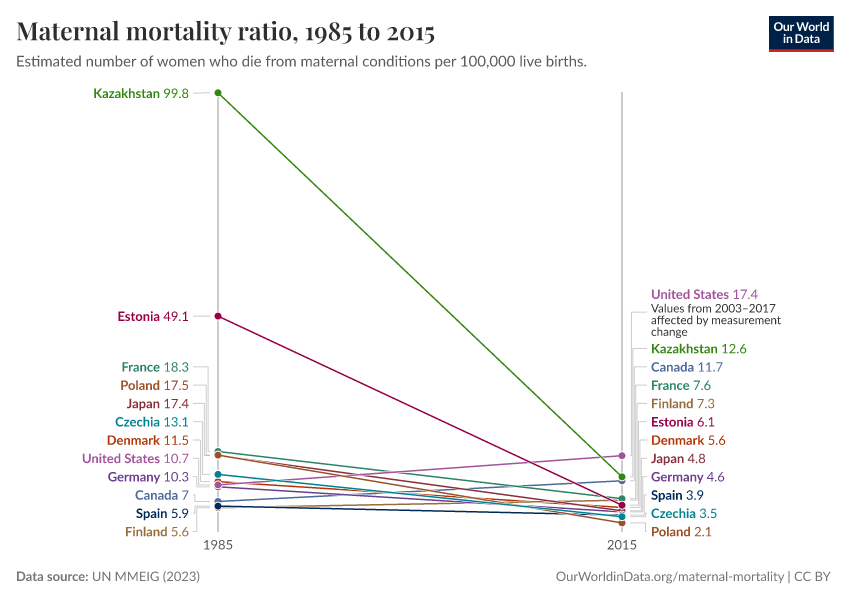 UN MMEIG (2023) – processed by Our World in Data. “Maternal mortality ratio” [dataset]. UN MMEIG (WHO, UNICEF, UNFPA, World Bank Group and UNDESA/ Population Division), “Trends in maternal mortality 2020” [original data]. Retrieved February 28, 2026 from https://data-diet-americans.owid.pages.dev:8789/20260119-065148/grapher/maternal-mortality-slope-chart.html (archived on January 19, 2026).