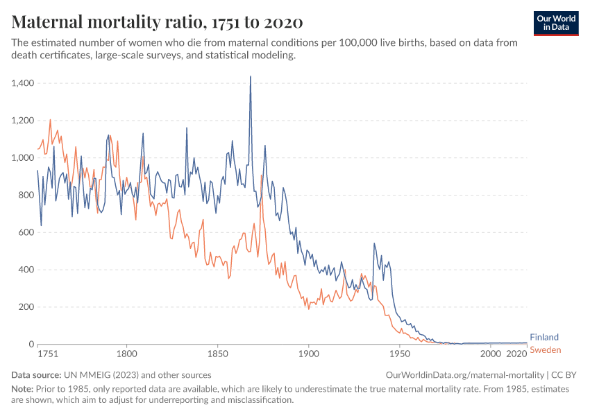 “Data Page: Maternal mortality ratio”, part of the following publication: Max Roser and Hannah Ritchie (2013) - “Maternal Mortality”. Data adapted from UN MMEIG (WHO, UNICEF, UNFPA, World Bank Group and UNDESA/ Population Division), WHO Mortality Database, United Nations, Gapminder. Retrieved from https://data-diet-americans.owid.pages.dev:8789/20260119-065148/grapher/maternal-mortality.html [online resource] (archived on January 19, 2026).