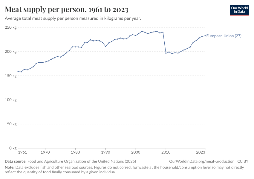 “Data Page: Yearly per capita supply of all meat”. Our World in Data (2026). Data adapted from Food and Agriculture Organization of the United Nations. Retrieved from https://data-diet-americans.owid.pages.dev:8789/20260116-144923/grapher/meat-supply-per-person.html [online resource] (archived on January 16, 2026).How to cite this data