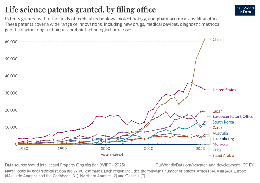 “Data Page: Life science patents granted, by filing office”, part of the following publication: Tuna Acisu, Saloni Dattani, Fiona Spooner, Veronika Samborska, Hannah Ritchie, and Max Roser (2025) - “Medicine and Biotechnology”. Data adapted from World Intellectual Property Organization (WIPO). Retrieved from https://data-diet-americans.owid.pages.dev:8789/20251031-120222/grapher/medicine-and-biotechnology-patents-granted-by-filing-office.html [online resource] (archived on October 31, 2025).How to cite this data