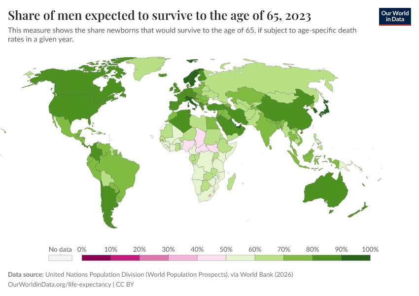“Data Page: Share of men expected to survive to the age of 65”. Our World in Data (2026). Data adapted from United Nations Population Division (World Population Prospects), via World Bank. Retrieved from https://data-diet-americans.owid.pages.dev:8789/20260202-181317/grapher/men-survival-to-age-65.html [online resource] (archived on February 2, 2026).How to cite this data