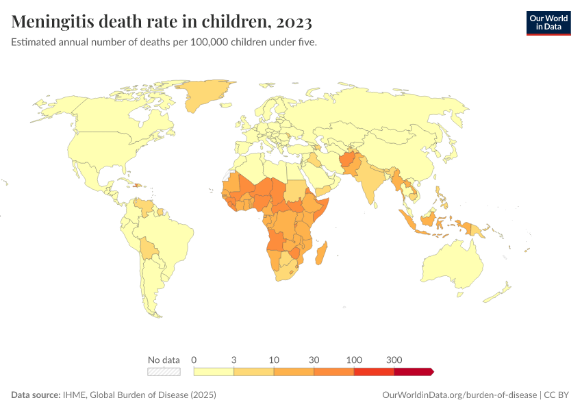 IHME, Global Burden of Disease (2025) – with major processing by Our World in Data. “Meningitis death rate in children” [dataset]. IHME, Global Burden of Disease, “Global Burden of Disease - Deaths” [original data]. Retrieved February 28, 2026 from https://data-diet-americans.owid.pages.dev:8789/20260211-174736/grapher/meningitis-death-rates-children-under-5.html (archived on February 11, 2026).