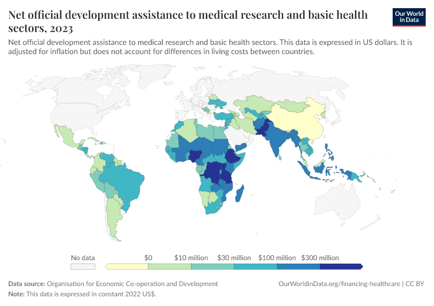 “Data Page: Net official development assistance to medical research and basic health sectors”. Our World in Data (2026). Data adapted from Organisation for Economic Co-operation and Development. Retrieved from https://data-diet-americans.owid.pages.dev:8789/20260130-180113/grapher/net-oda-to-medical-research.html [online resource] (archived on January 30, 2026).How to cite this data