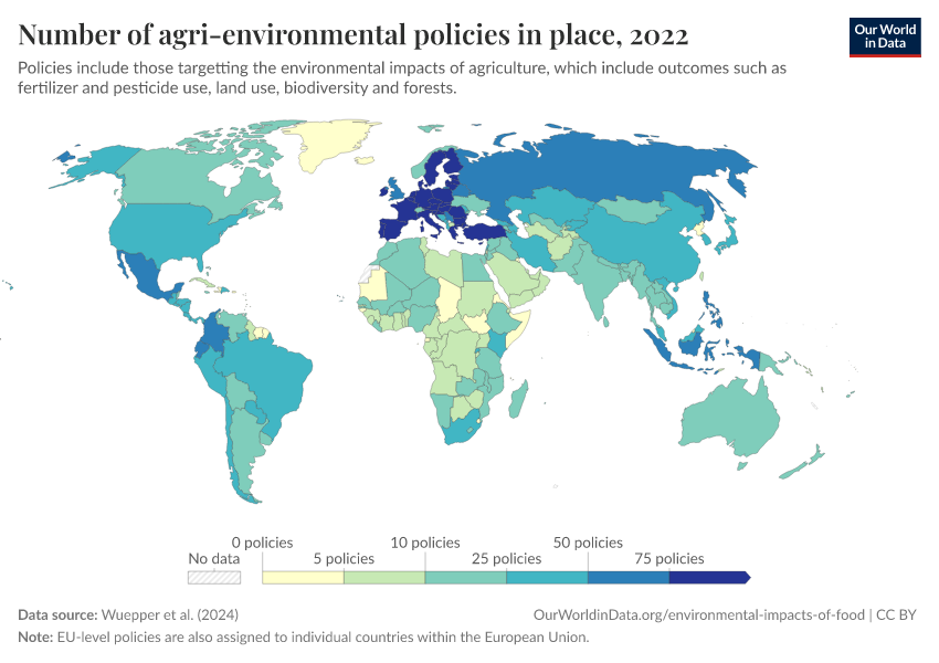 “Data Page: Number of agri-environmental policies in place”. Our World in Data (2026). Data adapted from Wuepper et al. (2024). Retrieved from https://data-diet-americans.owid.pages.dev:8789/20250909-093708/grapher/number-agri-environmental-policies.html [online resource] (archived on September 9, 2025).How to cite this data