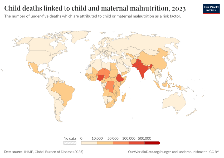 IHME, Global Burden of Disease (2025) – with major processing by Our World in Data. “Child deaths linked to child and maternal malnutrition” [dataset]. IHME, Global Burden of Disease, “Global Burden of Disease - Risk Factors - Deaths” [original data]. Retrieved February 28, 2026 from https://data-diet-americans.owid.pages.dev:8789/20260213-112438/grapher/number-child-deaths-malnutrition.html (archived on February 13, 2026).