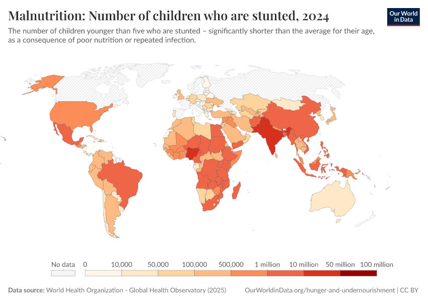 “Data Page: Malnutrition: Number of children who are stunted”. Our World in Data (2026). Data adapted from World Health Organization. Retrieved from https://data-diet-americans.owid.pages.dev:8789/20260119-070102/grapher/number-children-stunted-who.html [online resource] (archived on January 19, 2026).How to cite this data