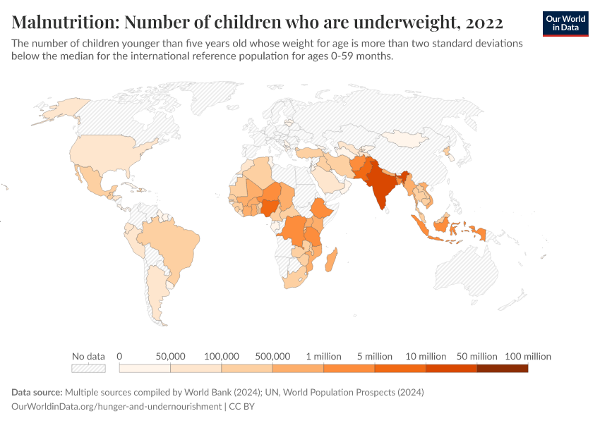“Data Page: Number of underweight children”. Our World in Data (2026). Data adapted from UNICEF, WHO, World Bank, United Nations. Retrieved from https://data-diet-americans.owid.pages.dev:8789/20260119-070102/grapher/number-of-children-who-are-underweight.html [online resource] (archived on January 19, 2026).How to cite this data