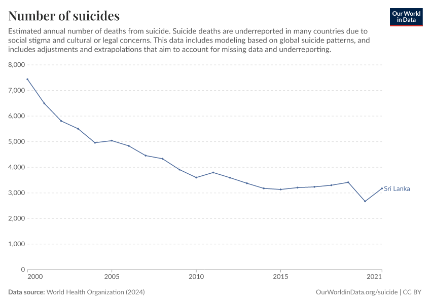 World Health Organization (2024) – with major processing by Our World in Data. “Number of suicides” [dataset]. World Health Organization, “Global Health Estimates” [original data]. Retrieved February 28, 2026 from https://data-diet-americans.owid.pages.dev:8789/20250909-093708/grapher/number-of-deaths-from-suicide-ghe.html (archived on September 9, 2025).