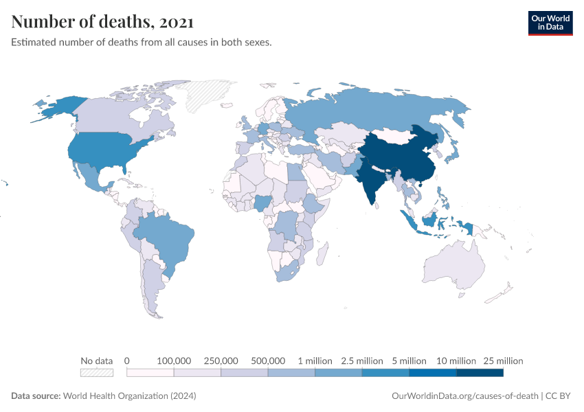 “Data Page: Number of deaths”, part of the following publication: Esteban Ortiz-Ospina and Max Roser (2016) - “Global Health”. Data adapted from World Health Organization. Retrieved from https://data-diet-americans.owid.pages.dev:8789/20250909-093708/grapher/number-of-deaths-who.html [online resource] (archived on September 9, 2025).How to cite this data