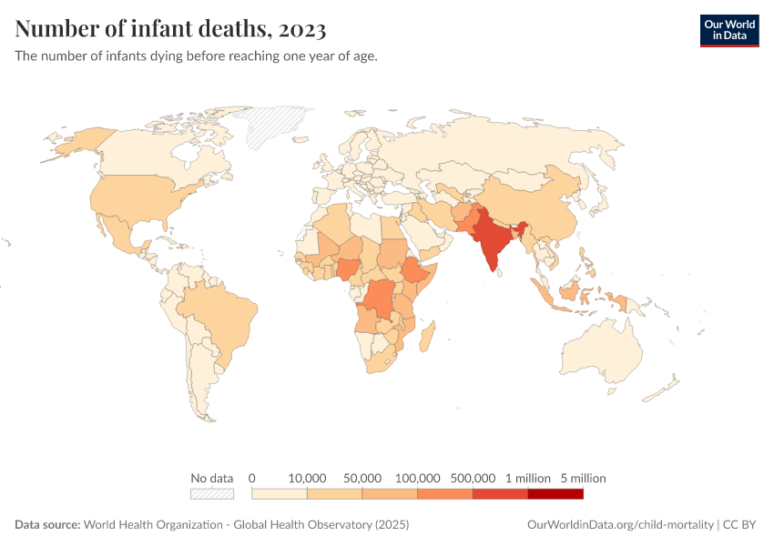 “Data Page: Number of infant deaths”. Our World in Data (2026). Data adapted from World Health Organization. Retrieved from https://data-diet-americans.owid.pages.dev:8789/20260119-070102/grapher/number-of-infant-deaths-gho.html [online resource] (archived on January 19, 2026).How to cite this data