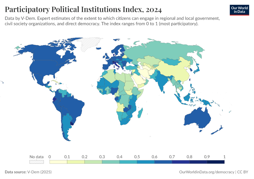 “Data Page: Participatory political institutions”, part of the following publication: Bastian Herre, Lucas Rodés-Guirao, and Esteban Ortiz-Ospina (2013) - “Democracy”. Data adapted from V-Dem. Retrieved from https://data-diet-americans.owid.pages.dev:8789/20260119-070102/grapher/participatory-political-institutions-index.html [online resource] (archived on January 19, 2026).How to cite this data