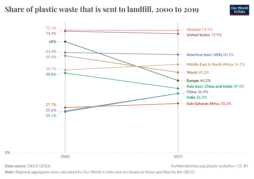 “Data Page: Share of plastic waste that is sent to landfill”, part of the following publication: Hannah Ritchie, Veronika Samborska, and Max Roser (2023) - “Plastic Pollution”. Data adapted from OECD. Retrieved from https://data-diet-americans.owid.pages.dev:8789/20250909-093708/grapher/plastic-waste-landfill.html [online resource] (archived on September 9, 2025).How to cite this data