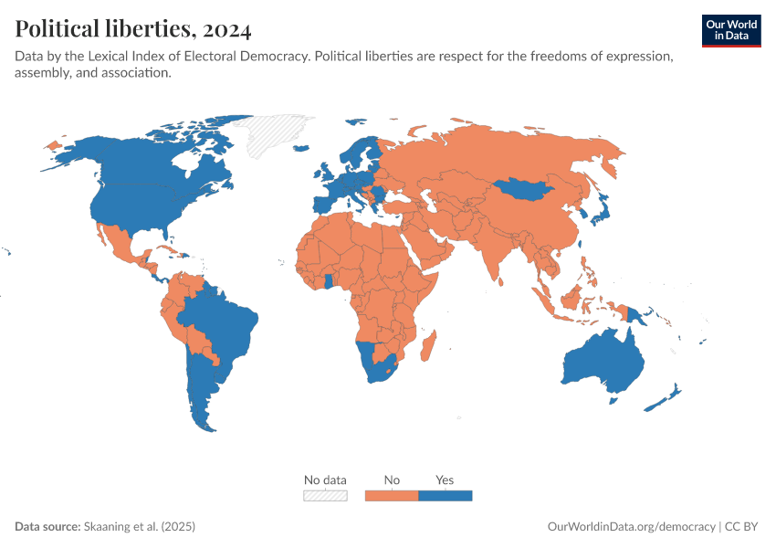 “Data Page: Political liberties”, part of the following publication: Bastian Herre, Lucas Rodés-Guirao, and Esteban Ortiz-Ospina (2013) - “Democracy”. Data adapted from Skaaning et al.. Retrieved from https://data-diet-americans.owid.pages.dev:8789/20260119-065148/grapher/political-liberties-lexical.html [online resource] (archived on January 19, 2026).How to cite this data