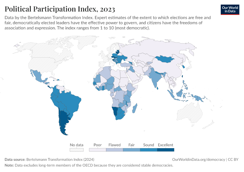 “Data Page: Political Participation Index”, part of the following publication: Bastian Herre, Lucas Rodés-Guirao, and Esteban Ortiz-Ospina (2013) - “Democracy”. Data adapted from Bertelsmann Transformation Index. Retrieved from https://data-diet-americans.owid.pages.dev:8789/20260105-133053/grapher/political-participation-index-bti.html [online resource] (archived on January 5, 2026).How to cite this data