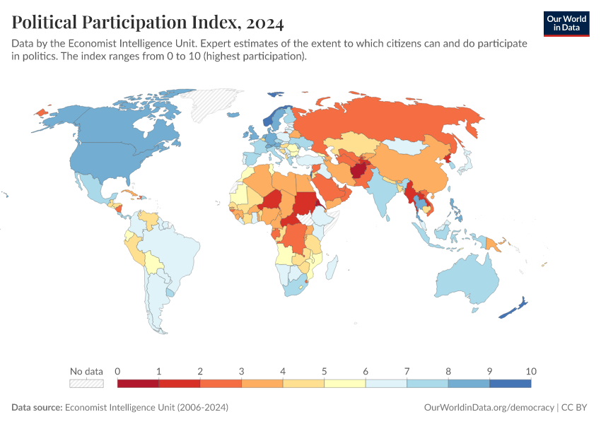 Economist Intelligence Unit (2006-2024) – processed by Our World in Data. “Political Participation Index” [dataset]. Economist Intelligence Unit, “Democracy Index 2021: The China challenge”; Economist Intelligence Unit, “Democracy Index 2022: Frontline democracy and the battle for Ukraine”; Economist Intelligence Unit, “Democracy Index 2023: Age of Conflict”; Economist Intelligence Unit, “Democracy Index 2024: What's wrong with representative democracy?”; Gapminder, “Democracy Index v4”; Various sources, “Population” [original data]. Retrieved February 28, 2026 from https://data-diet-americans.owid.pages.dev:8789/20260119-070102/grapher/political-participation-index-eiu.html (archived on January 19, 2026).