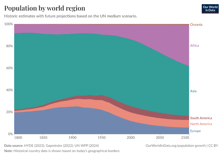 “Data Page: Population by world region”, part of the following publication: Hannah Ritchie, Lucas Rodés-Guirao, Edouard Mathieu, Marcel Gerber, Esteban Ortiz-Ospina, Joe Hasell, and Max Roser (2023) - “Population Growth”. Data adapted from PBL Netherlands Environmental Assessment Agency, Gapminder, United Nations. Retrieved from https://data-diet-americans.owid.pages.dev:8789/20260119-065148/grapher/population-regions-with-projections.html [online resource] (archived on January 19, 2026).How to cite this data