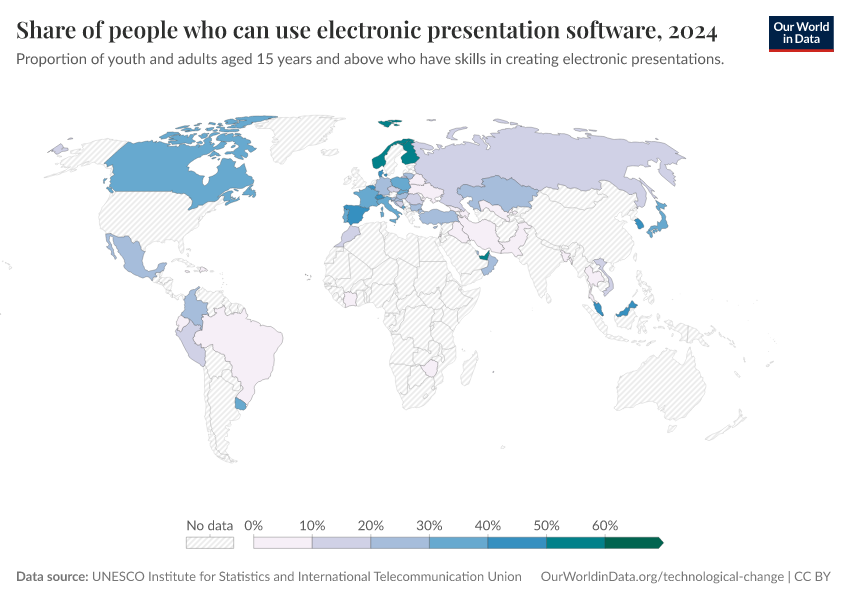“Data Page: Share of people who can use electronic presentation software”. Our World in Data (2026). Data adapted from UNESCO Institute for Statistics and International Telecommunication Union. Retrieved from https://data-diet-americans.owid.pages.dev:8789/20251120-211038/grapher/proportion-with-ict-skills-in-presentations.html [online resource] (archived on November 20, 2025).How to cite this data