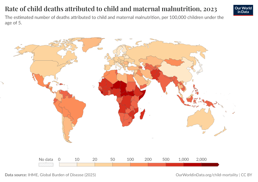 IHME, Global Burden of Disease (2025) – with major processing by Our World in Data. “Rate of child deaths attributed to child and maternal malnutrition” [dataset]. IHME, Global Burden of Disease, “Global Burden of Disease - Risk Factors - Deaths” [original data]. Retrieved February 28, 2026 from https://data-diet-americans.owid.pages.dev:8789/20260213-112438/grapher/rate-of-child-deaths-attributed-to-child-and-maternal-malnutrition.html (archived on February 13, 2026).