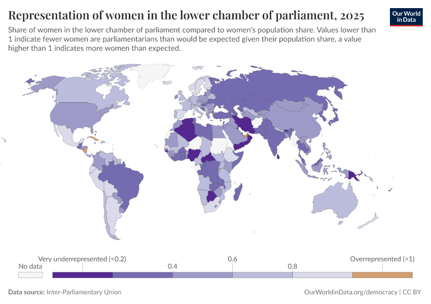 “Data Page: Representation of women in the lower chamber of parliament”. Our World in Data (2026). Data adapted from Inter-Parliamentary Union. Retrieved from https://data-diet-americans.owid.pages.dev:8789/20260130-180113/grapher/representation-of-women-in-lower-chamber-of-parliament.html [online resource] (archived on January 30, 2026).How to cite this data