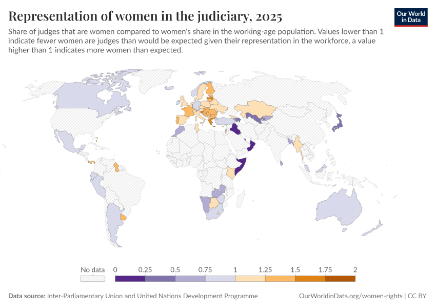 “Data Page: Representation of women in the judiciary”. Our World in Data (2026). Data adapted from Inter-Parliamentary Union and United Nations Development Programme. Retrieved from https://data-diet-americans.owid.pages.dev:8789/20260105-133053/grapher/representation-of-women-in-the-judiciary.html [online resource] (archived on January 5, 2026).How to cite this data