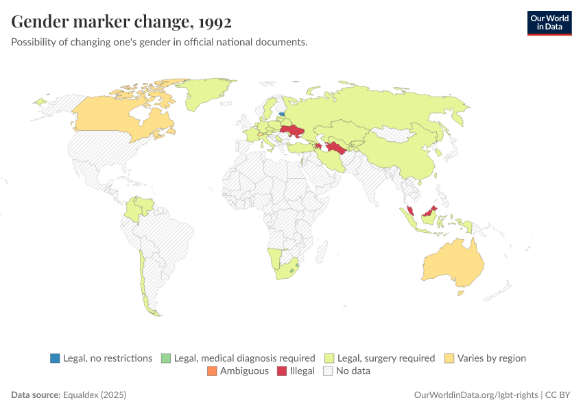 “Data Page: Gender marker change”, part of the following publication: Bastian Herre and Pablo Arriagada (2023) - “LGBT+ Rights”. Data adapted from Equaldex. Retrieved from https://data-diet-americans.owid.pages.dev:8789/20250909-093708/grapher/right-to-change-legal-gender-equaldex.html [online resource] (archived on September 9, 2025).How to cite this data
