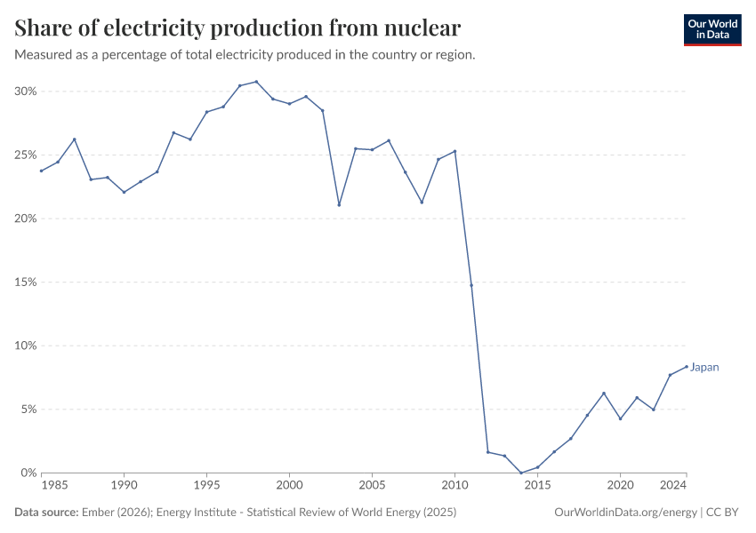 Ember (2026); Energy Institute - Statistical Review of World Energy (2025) – with major processing by Our World in Data. “Share of electricity generated by nuclear power” [dataset]. Ember, “Yearly Electricity Data Europe”; Ember, “Yearly Electricity Data”; Energy Institute, “Statistical Review of World Energy” [original data]. Retrieved February 28, 2026 from https://data-diet-americans.owid.pages.dev:8789/20260203-171503/grapher/share-electricity-nuclear.html (archived on February 3, 2026).