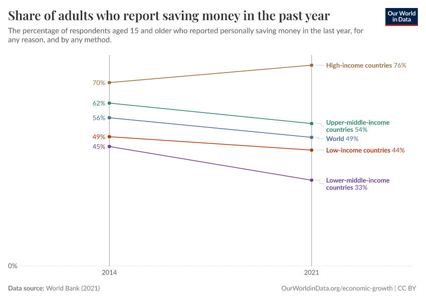 “Data Page: Share of adults who report saving money in the past year”, part of the following publication: Max Roser, Bertha Rohenkohl, Pablo Arriagada, Joe Hasell, Hannah Ritchie, and Esteban Ortiz-Ospina (2023) - “Economic Growth”. Data adapted from World Bank. Retrieved from https://data-diet-americans.owid.pages.dev:8789/20250909-093708/grapher/share-of-adults-who-report-saving-money-in-the-past-year.html [online resource] (archived on September 9, 2025).How to cite this data