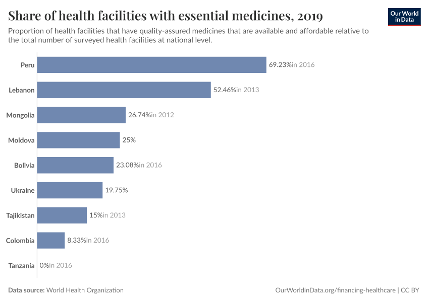 “Data Page: Share of health facilities with essential medicines”. Our World in Data (2026). Data adapted from World Health Organization. Retrieved from https://data-diet-americans.owid.pages.dev:8789/20251204-144539/grapher/share-of-health-facilities-with-essential-medicines.html [online resource] (archived on December 4, 2025).How to cite this data