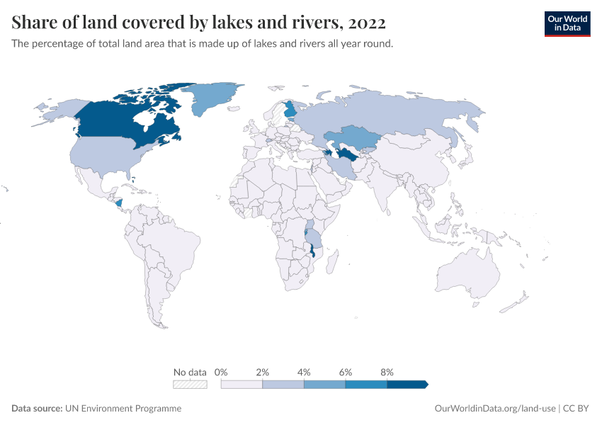 “Data Page: Share of land covered by lakes and rivers”. Our World in Data (2026). Data adapted from UN Environment Programme. Retrieved from https://data-diet-americans.owid.pages.dev:8789/20260130-180113/grapher/share-of-land-covered-by-lakes-and-rivers.html [online resource] (archived on January 30, 2026).How to cite this data