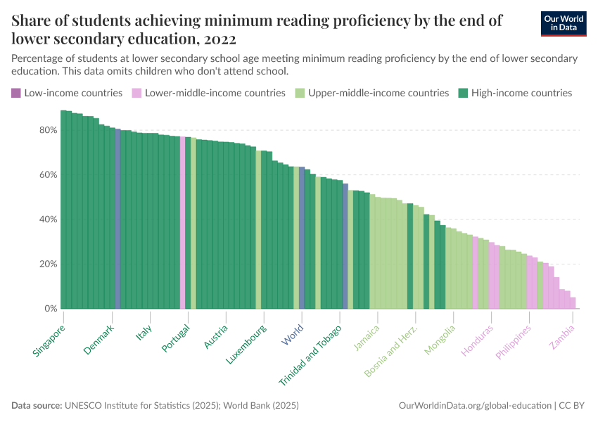 “Data Page: Share of students achieving minimum reading proficiency by the end of lower secondary education”, part of the following publication: Hannah Ritchie, Veronika Samborska, Esteban Ortiz-Ospina, and Max Roser (2023) - “Global Education”. Data adapted from UNESCO Institute for Statistics. Retrieved from https://data-diet-americans.owid.pages.dev:8789/20260122-091445/grapher/share-of-students-at-end-of-lower-secondary-education-with-minimum-reading-proficiency.html [online resource] (archived on January 22, 2026).How to cite this data
