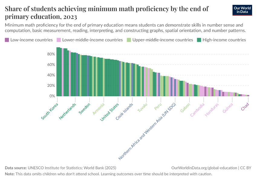 “Data Page: Share of students achieving minimum math proficiency by the end of primary education”. Our World in Data (2026). Data adapted from UNESCO Institute for Statistics. Retrieved from https://data-diet-americans.owid.pages.dev:8789/20260130-180113/grapher/share-of-students-at-end-of-primary-education-achieving-minimum-math-proficiency.html [online resource] (archived on January 30, 2026).How to cite this data