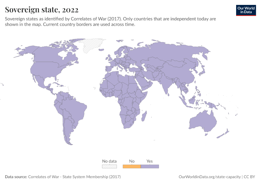 “Data Page: Sovereign state”, part of the following publication: Bastian Herre and Pablo Arriagada (2023) - “State Capacity”. Data adapted from Correlates of War. Retrieved from https://data-diet-americans.owid.pages.dev:8789/20251208-134119/grapher/sovereign-state-cow.html [online resource] (archived on December 8, 2025).How to cite this data