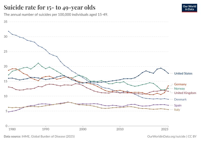 “Data Page: Suicide rate for 15- to 49-year olds”, part of the following publication: Esteban Ortiz-Ospina and Max Roser (2016) - “Global Health”. Data adapted from IHME, Global Burden of Disease. Retrieved from https://data-diet-americans.owid.pages.dev:8789/20260211-174736/grapher/suicide-rate-for-15--to-49-year-olds.html [online resource] (archived on February 11, 2026).How to cite this data