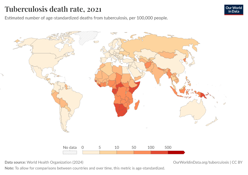 World Health Organization (2024) – with major processing by Our World in Data. “Tuberculosis death rate” [dataset]. World Health Organization, “Global Health Estimates” [original data]. Retrieved February 28, 2026 from https://data-diet-americans.owid.pages.dev:8789/20250909-093708/grapher/tuberculosis-death-rate-age-standardized.html (archived on September 9, 2025).