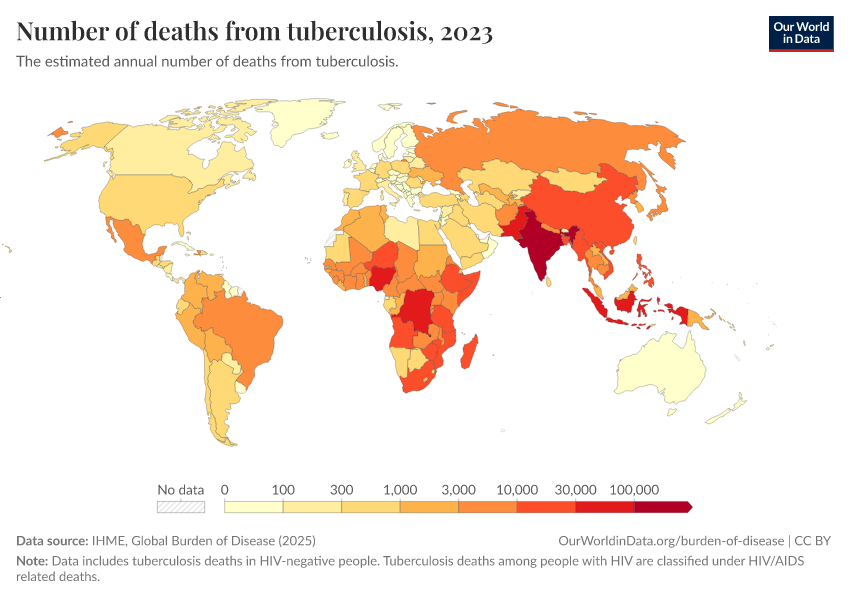 “Data Page: Number of deaths from tuberculosis”, part of the following publication: Esteban Ortiz-Ospina and Max Roser (2016) - “Global Health”. Data adapted from IHME, Global Burden of Disease. Retrieved from https://data-diet-americans.owid.pages.dev:8789/20260211-174736/grapher/tuberculosis-deaths.html [online resource] (archived on February 11, 2026).How to cite this data