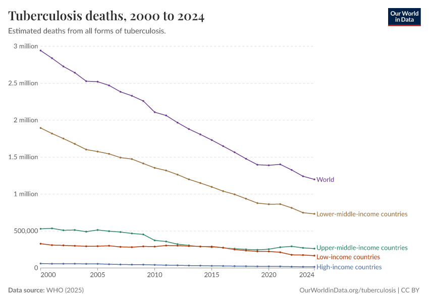 WHO (2025) – with minor processing by Our World in Data. “Tuberculosis deaths” [dataset]. WHO, “Global Tuberculosis Report - Burden Estimates” [original data]. Retrieved February 28, 2026 from https://data-diet-americans.owid.pages.dev:8789/20260205-170810/grapher/tuberculosis-deaths-who.html (archived on February 5, 2026).