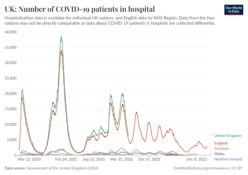Government of the United Kingdom (2024) – with minor processing by Our World in Data. “UK: Number of COVID-19 patients in hospital” [dataset]. Government of the United Kingdom, “UKHSA data dashboard” [original data]. Retrieved February 28, 2026 from https://data-diet-americans.owid.pages.dev:8789/20250909-093708/grapher/uk-covid-hospital-patients.html (archived on September 9, 2025).