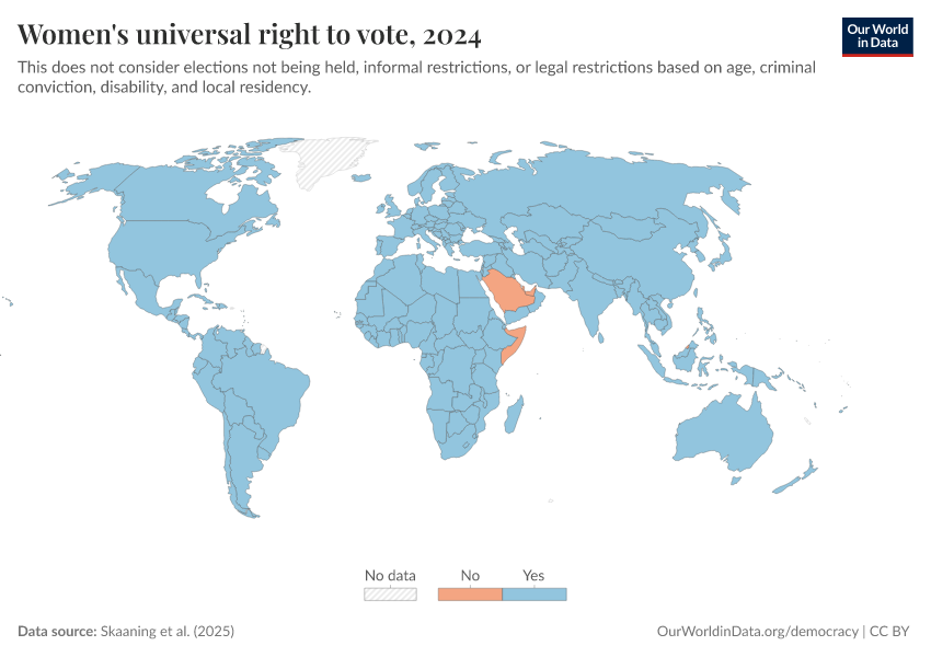 Skaaning et al. (2025) – processed by Our World in Data. “Women's universal right to vote” [dataset]. Skaaning et al., “Lexical Index of Electoral Democracy (LIED) v6.8” [original data]. Retrieved February 28, 2026 from https://data-diet-americans.owid.pages.dev:8789/20260119-065148/grapher/universal-suffrage-women-lexical.html (archived on January 19, 2026).