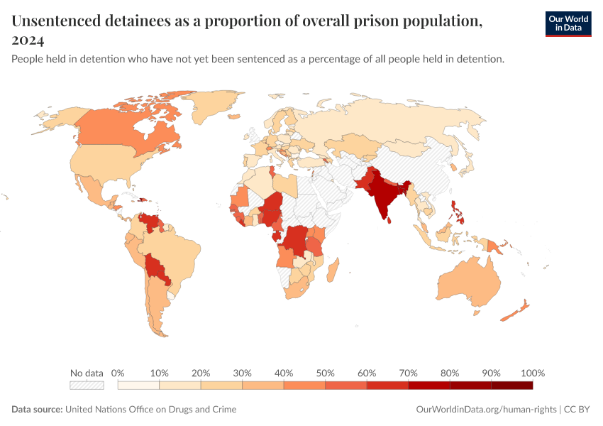 “Data Page: Unsentenced detainees as a proportion of overall prison population”. Our World in Data (2026). Data adapted from United Nations Office on Drugs and Crime. Retrieved from https://data-diet-americans.owid.pages.dev:8789/20260130-180113/grapher/unsentenced-detainees-as-proportion-of-prison-population.html [online resource] (archived on January 30, 2026).How to cite this data