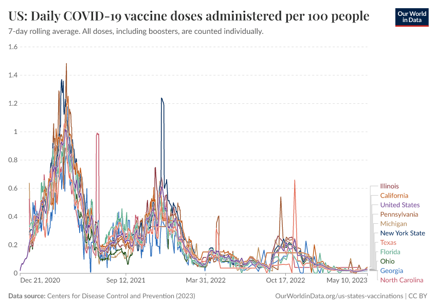 Centers for Disease Control and Prevention (2023) – processed by Our World in Data. “US: Daily COVID-19 vaccine doses administered per 100 people” [dataset]. Centers for Disease Control and Prevention, “COVID-19, Vaccinations (United States)” [original data]. Retrieved February 28, 2026 from https://data-diet-americans.owid.pages.dev:8789/20250909-093708/grapher/us-daily-covid-vaccine-doses-per-100.html (archived on September 9, 2025).